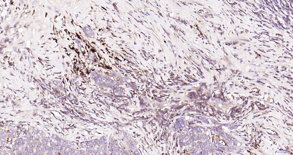 Paraformaldehyde-fixed, paraffin embedded Human Breast Cancer; Antigen retrieval by boiling in sodium citrate buffer (pH6.0) for 15 min; Antibody incubation with Nrf2 Polyclonal Antibody, Unconjugated (bs-1074R) at 1:200 overnight at 4°C, followed by conjugation to the SP Kit (Rabbit, SP-0023) and DAB (C-0010) staining.