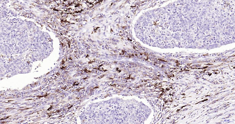 Paraformaldehyde-fixed, paraffin embedded Human Cervical Cancer; Antigen retrieval by boiling in sodium citrate buffer (pH6.0) for 15 min; Antibody incubation with Nrf2 Polyclonal Antibody, Unconjugated (bs-1074R) at 1:200 overnight at 4°C, followed by conjugation to the SP Kit (Rabbit, SP-0023) and DAB (C-0010) staining.