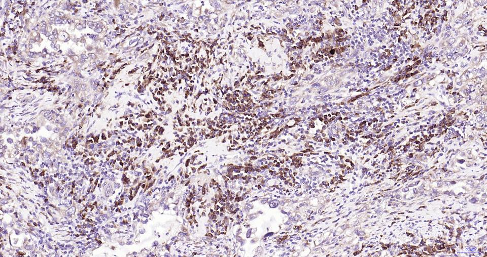 Paraformaldehyde-fixed, paraffin embedded Human Pancreatic Cancer; Antigen retrieval by boiling in sodium citrate buffer (pH6.0) for 15 min; Antibody incubation with Nrf2 Polyclonal Antibody, Unconjugated (bs-1074R) at 1:200 overnight at 4°C, followed by conjugation to the SP Kit (Rabbit, SP-0023) and DAB (C-0010) staining.