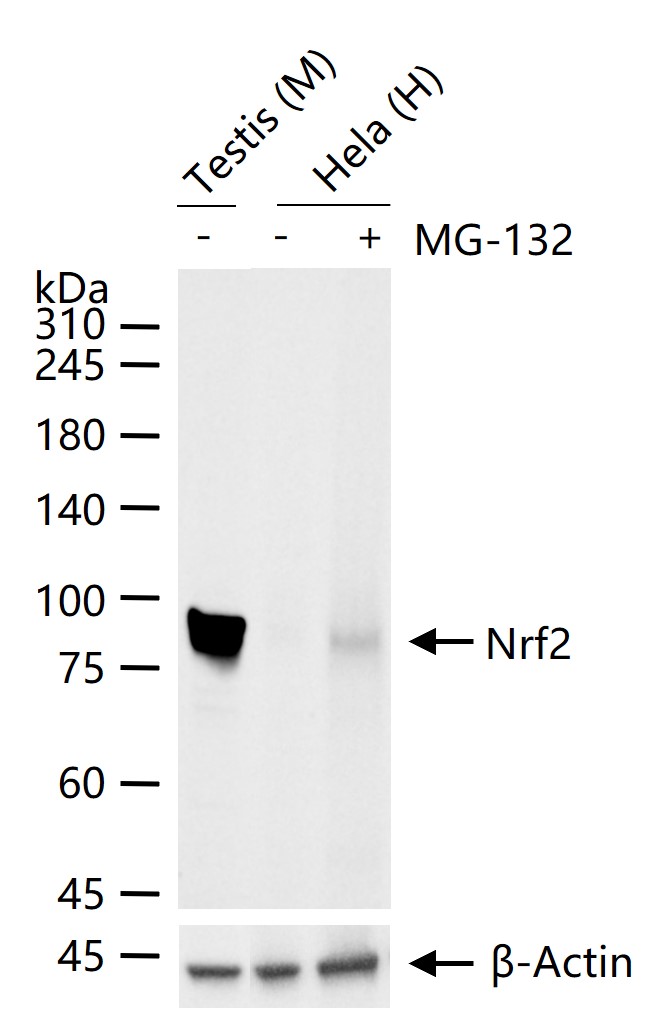 Hela (H) cells were treated with or without MG-132 (10 μM) for 10h, 25 μg total protein per lane of cell lysates (see on figure) probed with Nrf2 monoclonal antibody, unconjugated (bsm-61093R) at 1:1000 dilution and 4°C overnight incubation. Followed by conjugated secondary antibody incubation at r.t. for 60 min.