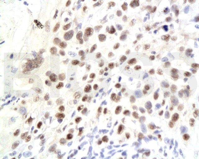 Paraformaldehyde-fixed, paraffin embedded (human breast carcinoma); Antigen retrieval by boiling in sodium citrate buffer (pH6.0) for 15min; Block endogenous peroxidase by 3% hydrogen peroxide for 20 minutes; Blocking buffer (normal goat serum) at 37°C for 30min; Antibody incubation with (CDKN1A) Polyclonal Antibody, Unconjugated (bs-0741R) at 1:200 overnight at 4°C, followed by operating according to SP Kit(Rabbit) (sp-0023) instructionsand DAB staining.