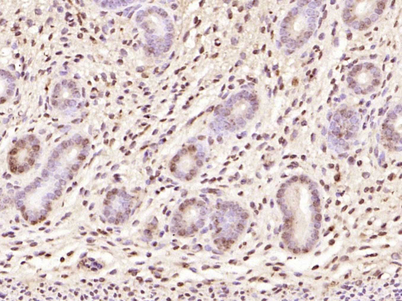 Paraformaldehyde-fixed, paraffin embedded (rat uterus); Antigen retrieval by boiling in sodium citrate buffer (pH6.0) for 15min; Block endogenous peroxidase by 3% hydrogen peroxide for 20 minutes; Blocking buffer (normal goat serum) at 37°C for 30min; Antibody incubation with (CDKN1A) Polyclonal Antibody, Unconjugated (bs-0741R) at 1:200 overnight at 4°C, followed by operating according to SP Kit(Rabbit) (sp-0023) instructionsand DAB staining.