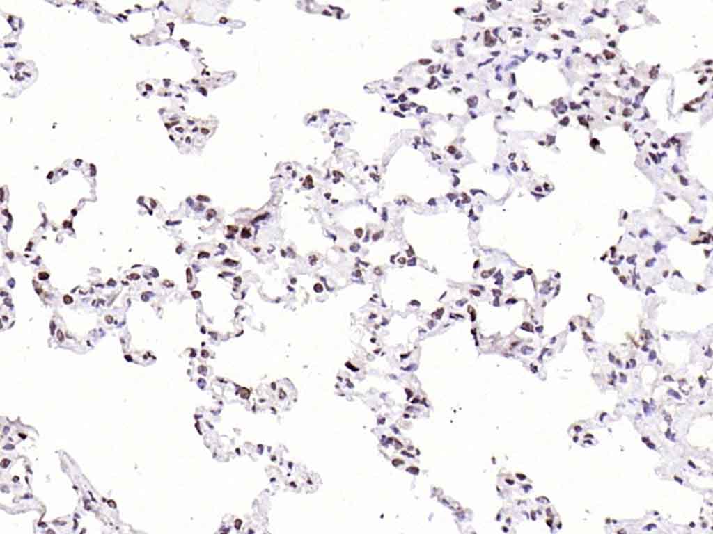 Paraformaldehyde-fixed, paraffin embedded (mouse lung); Antigen retrieval by boiling in sodium citrate buffer (pH6.0) for 15min; Block endogenous peroxidase by 3% hydrogen peroxide for 20 minutes; Blocking buffer (normal goat serum) at 37°C for 30min; Antibody incubation with (CDKN1A) Polyclonal Antibody, Unconjugated (bs-0741R) at 1:200 overnight at 4°C, followed by operating according to SP Kit(Rabbit) (sp-0023) instructionsand DAB staining.