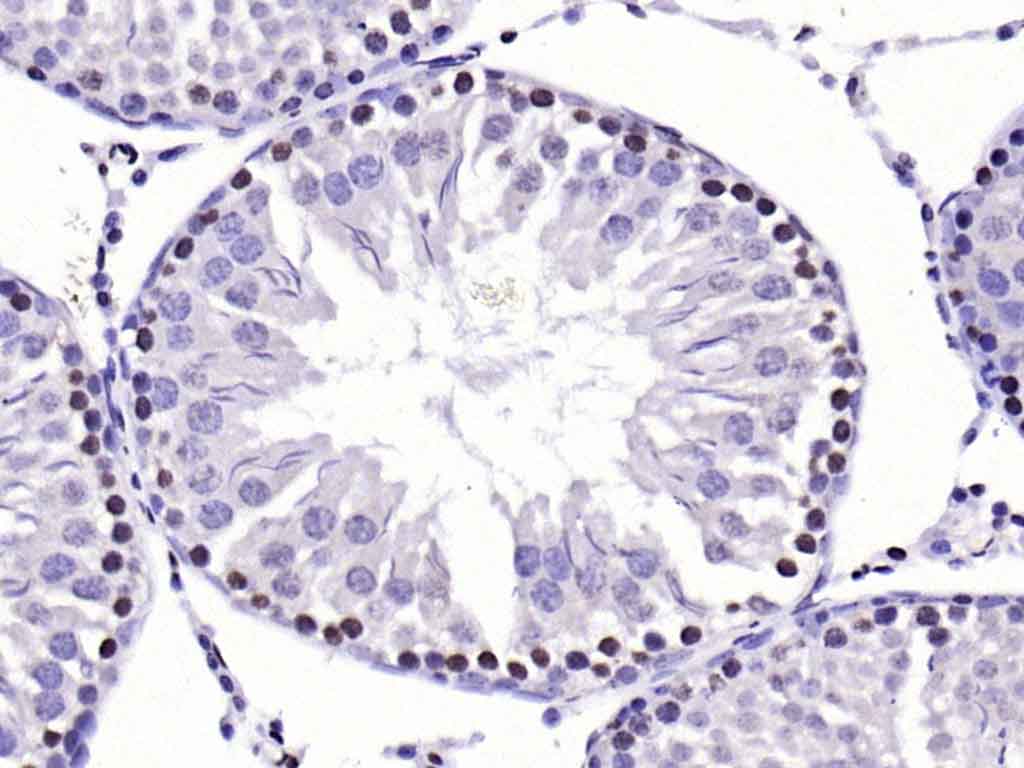 Paraformaldehyde-fixed, paraffin embedded (mouse testis); Antigen retrieval by boiling in sodium citrate buffer (pH6.0) for 15min; Block endogenous peroxidase by 3% hydrogen peroxide for 20 minutes; Blocking buffer (normal goat serum) at 37°C for 30min; Antibody incubation with (CDKN1A) Polyclonal Antibody, Unconjugated (bs-0741R) at 1:200 overnight at 4°C, followed by operating according to SP Kit(Rabbit) (sp-0023) instructionsand DAB staining.
