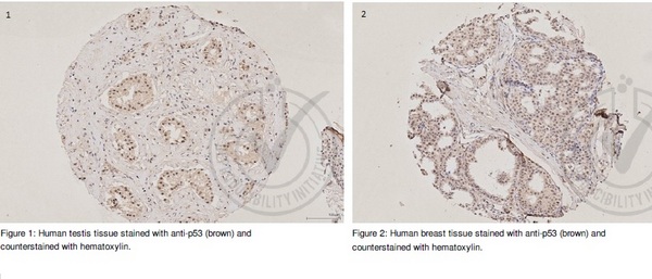 Independently Validated Antibody, image provided by Science Direct, badge number 029660. Formalin-fixed and paraffin embedded human testis and breast tissue stained with Rabbit Anti-P53 protein(wt-p53) Polyclonal Antibody at 1:250 at room temperature overnight. Both positive and negative controls stained.