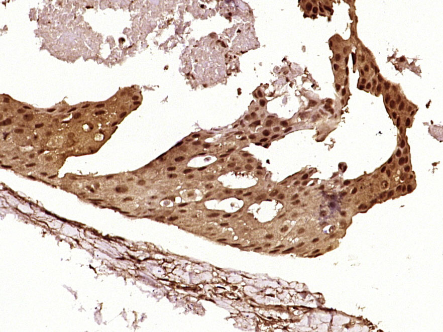 Paraformaldehyde-fixed, paraffin embedded (Human breast cancer); Antigen retrieval by boiling in sodium citrate buffer (pH6.0) for 15min; Block endogenous peroxidase by 3% hydrogen peroxide for 20 minutes; Blocking buffer (normal goat serum) at 37°C for 30min; Antibody incubation with (P53 protein(wt-p53)) Polyclonal Antibody, Unconjugated (bs-0033R) at 1:400 overnight at 4°C, followed by operating according to SP Kit(Rabbit) (sp-0023) instructions and DAB staining.