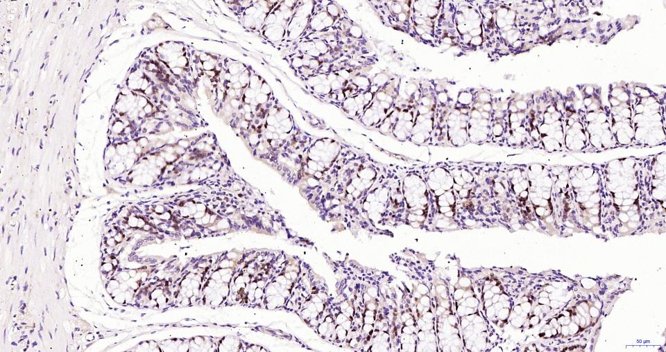 Paraformaldehyde-fixed, paraffin embedded Mouse Colon; Antigen retrieval by boiling in sodium citrate buffer (pH6.0) for 15 min; Antibody incubation with PCNA Polyclonal Antibody, Unconjugated (bs-0754R) at 1:800 overnight at 4°C, followed by conjugation to the SP Kit (Rabbit, SP-0023) and DAB (C-0010) staining.