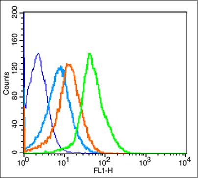 The cells were fixed with 2% paraformaldehyde for 10 min at 37℃. Primary antibody (bs-0231R, 1μg /1x10^6 cells) were incubated for 30 min at room temperature, followed by 1 X PBS containing 0.5% BSA + 1 0% goat serum (15 min) to block non-specific protein-protein interactions. Then the Goat Anti-rabbit IgG/FITC antibody was added into the blocking buffer mentioned above to react with the primary antibody at 1/200 dilution for 40 min on ice. Acquisition of 20,000 events was performed.