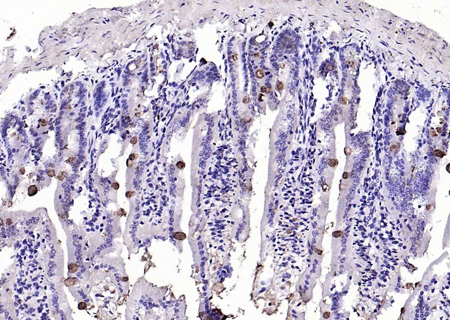 Paraformaldehyde-fixed, paraffin embedded (Mouse small intestine); Antigen retrieval by boiling in sodium citrate buffer (pH6.0) for 15min; Block endogenous peroxidase by 3% hydrogen peroxide for 20 minutes; Blocking buffer (normal goat serum) at 37°C for 30min; Antibody incubation with (TFF3 ) Polyclonal Antibody, Unconjugated (bs-0535R) at 1:200 overnight at 4°C, followed by operating according to SP Kit(Rabbit) (sp-0023) instructionsand DAB staining.