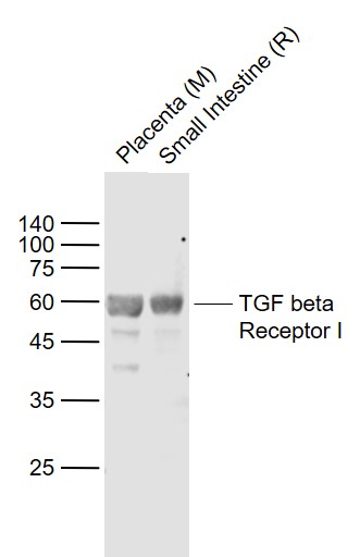 Sample: Lane 1: Placenta (Mouse) Lysate at 40 ug Lane 2: Small intestine (Rat) Lysate at 40 ug Primary: Anti- TGF beta Receptor I (bs-0638R) at 1/1000 dilution Secondary: IRDye800CW Goat Anti-Rabbit IgG at 1/20000 dilution Predicted band size: 56 kD Observed band size: 58 kD