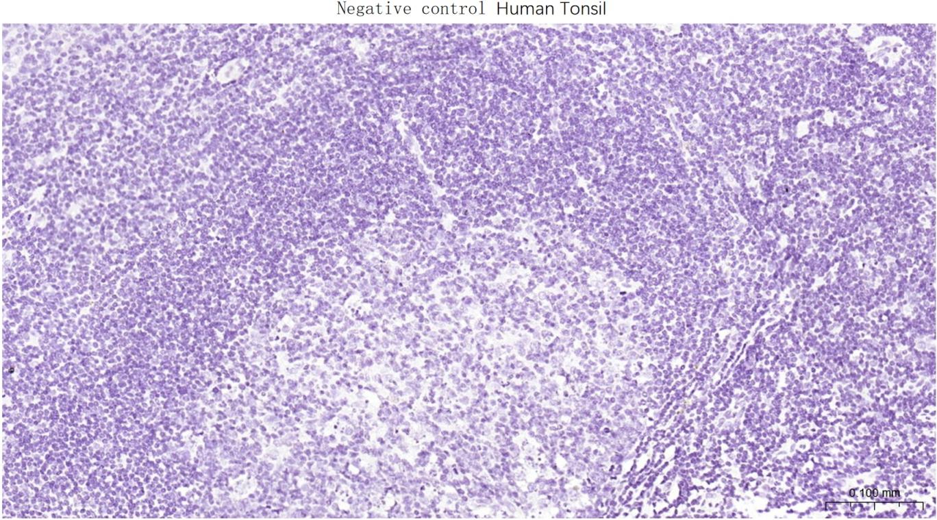 (Negative control) Paraformaldehyde-fixed, paraffin embedded Human Tonsil; Antigen retrieval by boiling in sodium citrate buffer (pH6.0) for 15 min; Antibody incubation with TTF1/NKX2-1 Polyclonal Antibody, Unconjugated (bs-0826R) at 1:200 overnight at 4°C, followed by conjugation to the bs-0295G-HRP and DAB (C-0010) staining.