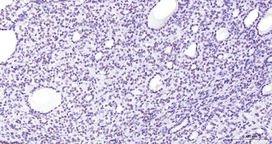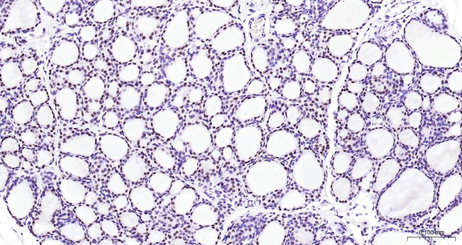 Paraformaldehyde-fixed, paraffin embedded Rat Thyroid Gland; Antigen retrieval by boiling in sodium citrate buffer (pH6.0) for 15 min; Antibody incubation with TTF1/NKX2-1 Polyclonal Antibody, Unconjugated (bs-0826R) at 1:200 overnight at 4°C, followed by conjugation to the bs-0295G-HRP and DAB (C-0010) staining.