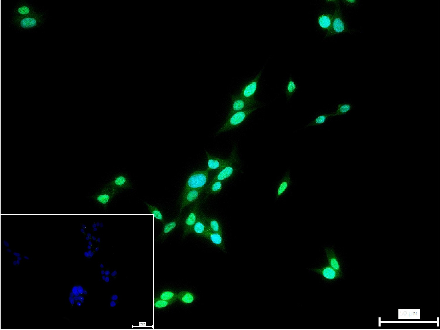 4% Paraformaldehyde-fixed TT (H) cell; Triton X-100 at r.t. for 20 min; Antibody incubation with (TTF1/NKX2-1) polyclonal Antibody, unconjugated (bs-0826R) 1:100, 90 min at 37°C; followed by conjugated Goat Anti-Rabbit IgG antibody (green, bs-40295G-FITC) at 37°C for 90 min, DAPI (blue, C02-04002) was used to stain the cell nuclei. PBS instead of the primary antibody was used as the blank control.