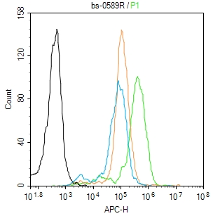 Blank control:Molt-4. Primary Antibody (green line): Rabbit Anti-WWOX antibody (bs-0589R) Dilution: 1μg /10^6 cells; Isotype Control Antibody (orange line): Rabbit IgG . Secondary Antibody : Goat anti-rabbit IgG-AF647 Dilution: 1μg /test. Protocol The cells were fixed with 4% PFA (10min at room temperature)and then permeabilized with 90% ice-cold methanol for 20 min at-20℃. The cells were then incubated in 5%BSA to block non-specific protein-protein interactions for 30 min at at room temperature .Cells stained with Primary Antibody for 30 min at room temperature. The secondary antibody used for 40 min at room temperature. Acquisition of 20,000 events was performed.