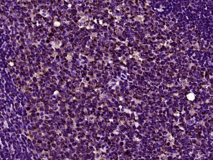 Paraformaldehyde-fixed, paraffin embedded (Human tonsil); Antigen retrieval by boiling in sodium citrate buffer (pH6.0) for 15min; Block endogenous peroxidase by 3% hydrogen peroxide for 20 minutes; Blocking buffer (normal goat serum) at 37°C for 30min; Antibody incubation with (galectin 9) Polyclonal Antibody, Unconjugated (bs-0604R) at 1:400 overnight at 4°C, followed by operating according to SP Kit(Rabbit) (sp-0023) instructions and DAB staining.