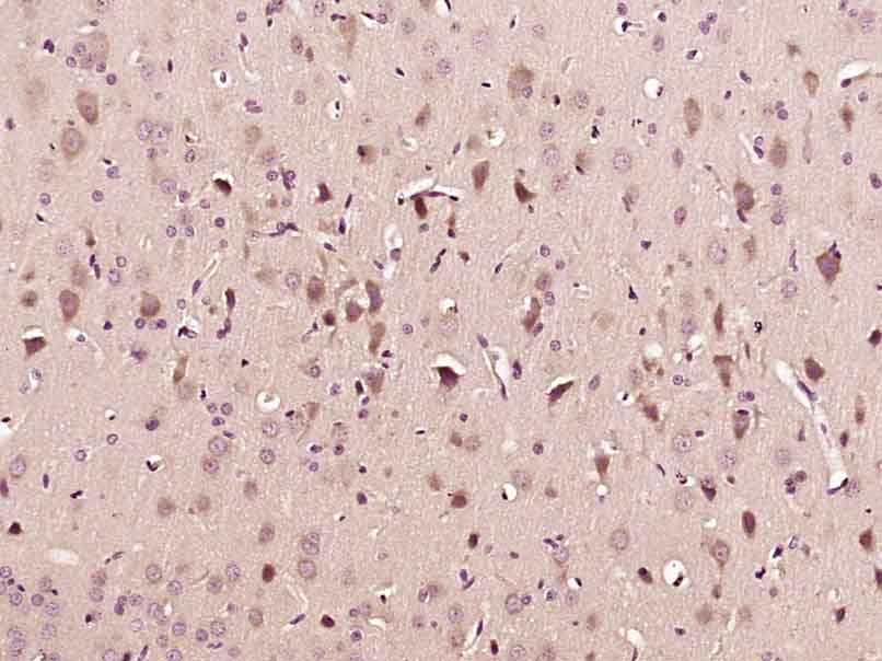 Paraformaldehyde-fixed, paraffin embedded (Mouse brain); Antigen retrieval by boiling in sodium citrate buffer (pH6.0) for 15min; Block endogenous peroxidase by 3% hydrogen peroxide for 20 minutes; Blocking buffer (normal goat serum) at 37°C for 30min; Antibody incubation with (GABA B Receptor 2) Polyclonal Antibody, Unconjugated (bs-1293R) at 1:400 overnight at 4°C, followed by operating according to SP Kit(Rabbit) (sp-0023) instructionsand DAB staining.