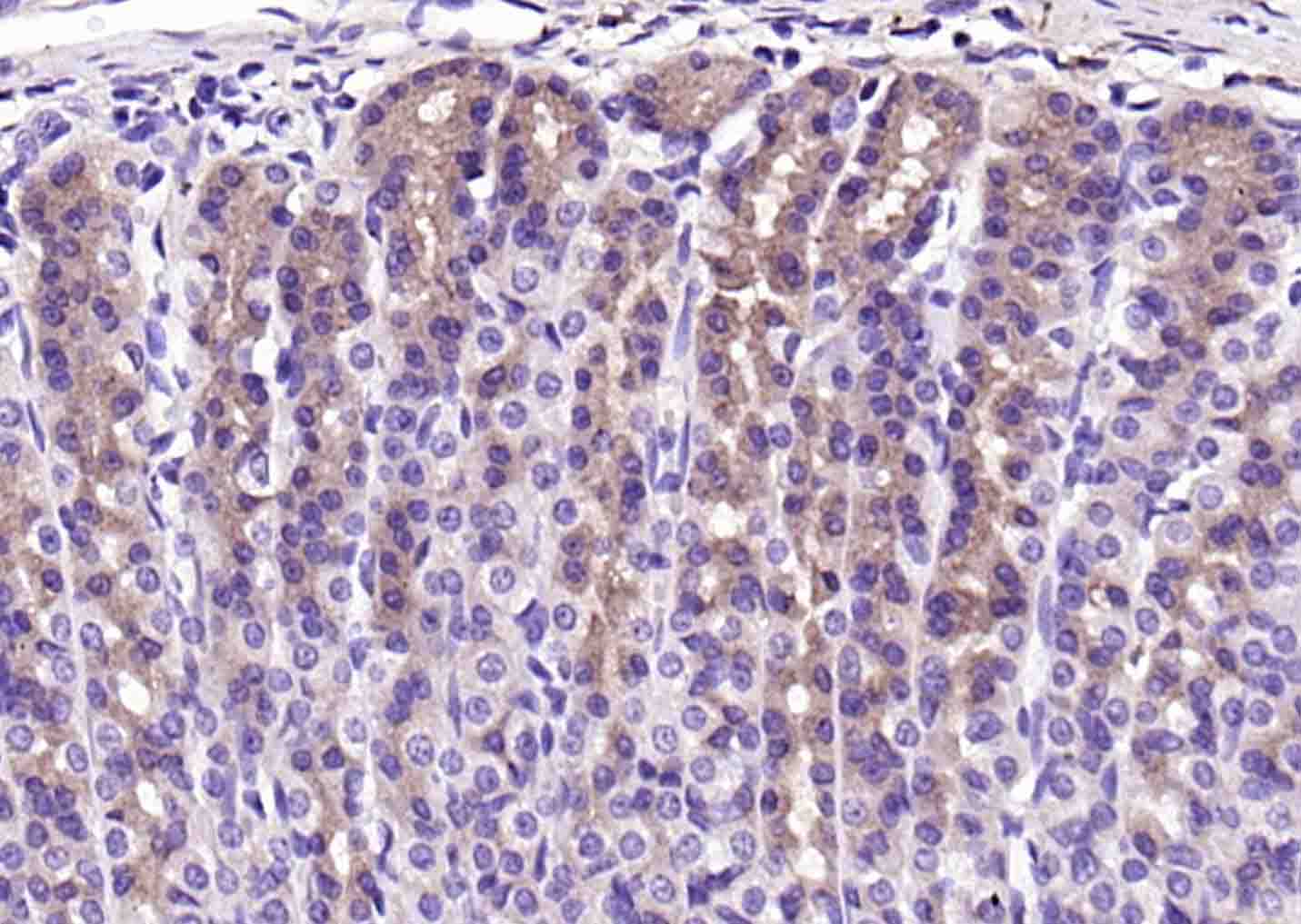 Paraformaldehyde-fixed, paraffin embedded (rat stomach); Antigen retrieval by boiling in sodium citrate buffer (pH6.0) for 15min; Block endogenous peroxidase by 3% hydrogen peroxide for 20 minutes; Blocking buffer (normal goat serum) at 37°C for 30min; Antibody incubation with (SFRP1) Polyclonal Antibody, Unconjugated (bs-1303R) at 1:200 overnight at 4°C, followed by operating according to SP Kit(Rabbit) (sp-0023) instructionsand DAB staining.