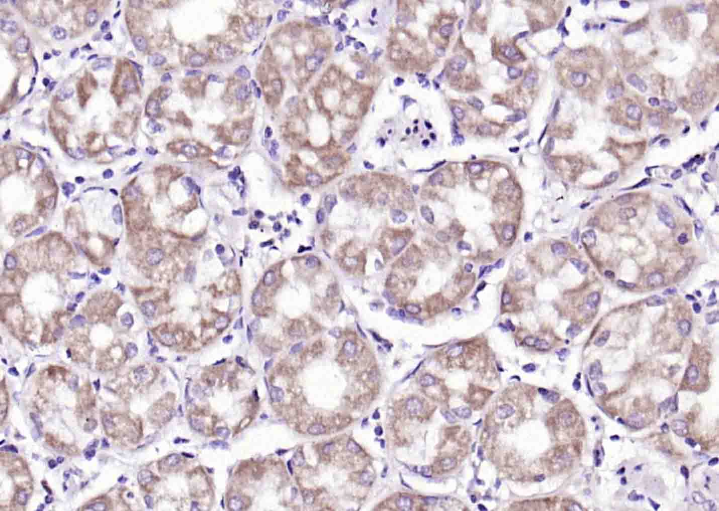 Paraformaldehyde-fixed, paraffin embedded (Human stomach); Antigen retrieval by boiling in sodium citrate buffer (pH6.0) for 15min; Block endogenous peroxidase by 3% hydrogen peroxide for 20 minutes; Blocking buffer (normal goat serum) at 37°C for 30min; Antibody incubation with (SFRP1) Polyclonal Antibody, Unconjugated (bs-1303R) at 1:200 overnight at 4°C, followed by operating according to SP Kit(Rabbit) (sp-0023) instructionsand DAB staining.