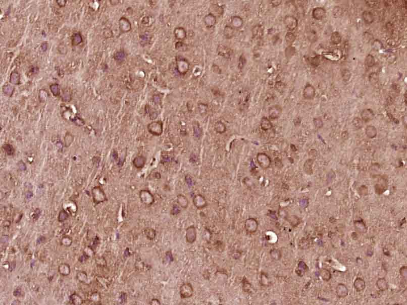 Paraformaldehyde-fixed, paraffin embedded (Mouse brain); Antigen retrieval by boiling in sodium citrate buffer (pH6.0) for 15min; Block endogenous peroxidase by 3% hydrogen peroxide for 20 minutes; Blocking buffer (normal goat serum) at 37°C for 30min; Antibody incubation with (G-CSF) Polyclonal Antibody, Unconjugated (bs-1023R) at 1:400 overnight at 4°C, followed by operating according to SP Kit(Rabbit) (sp-0023) instructionsand DAB staining.