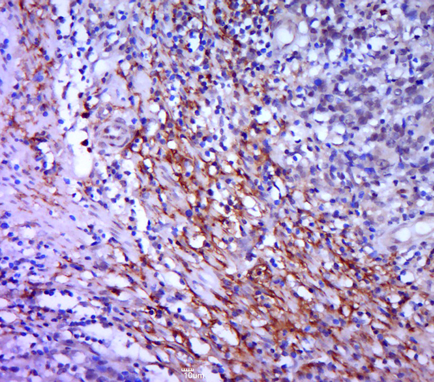 Paraformaldehyde-fixed, paraffin embedded (Human cervical cancer); Antigen retrieval by boiling in sodium citrate buffer (pH6.0) for 15min; Block endogenous peroxidase by 3% hydrogen peroxide for 20 minutes; Blocking buffer (normal goat serum) at 37°C for 30min; Antibody incubation with (Syndecan-1) Polyclonal Antibody, Unconjugated (bs-1309R) at 1:500 overnight at 4°C, followed by a conjugated secondary (sp-0023) for 20 minutes and DAB staining.