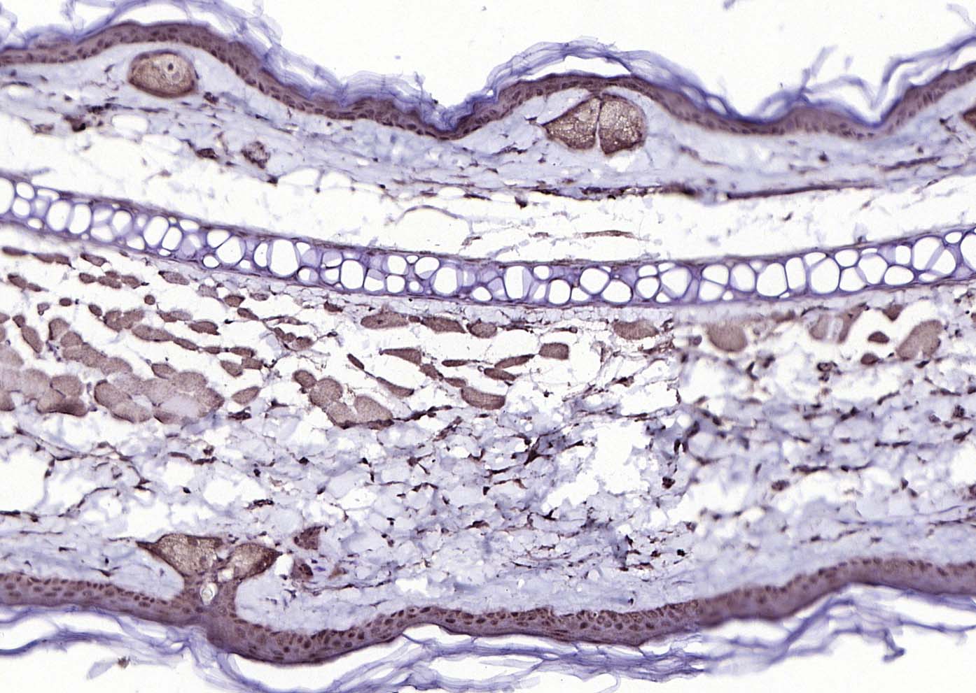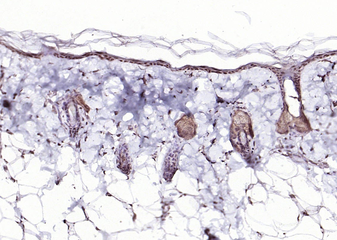 Paraformaldehyde-fixed, paraffin embedded (mouse skin); Antigen retrieval by boiling in sodium citrate buffer (pH6.0) for 15min; Block endogenous peroxidase by 3% hydrogen peroxide for 20 minutes; Blocking buffer (normal goat serum) at 37°C for 30min; Antibody incubation with (P73) Polyclonal Antibody, Unconjugated (bs-1346R) at 1:200 overnight at 4°C, followed by operating according to SP Kit(Rabbit) (sp-0023) instructionsand DAB staining.