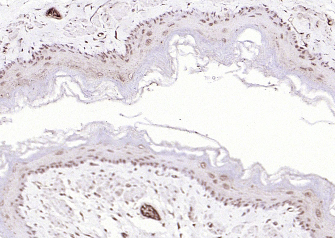 Paraformaldehyde-fixed, paraffin embedded (rat skin); Antigen retrieval by boiling in sodium citrate buffer (pH6.0) for 15min; Block endogenous peroxidase by 3% hydrogen peroxide for 20 minutes; Blocking buffer (normal goat serum) at 37°C for 30min; Antibody incubation with (P73) Polyclonal Antibody, Unconjugated (bs-1346R) at 1:200 overnight at 4°C, followed by operating according to SP Kit(Rabbit) (sp-0023) instructionsand DAB staining.
