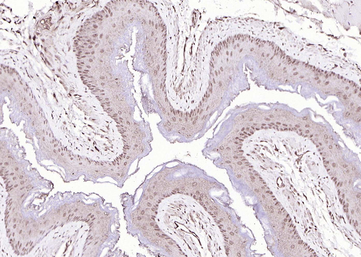 Paraformaldehyde-fixed, paraffin embedded (mouse esophagus); Antigen retrieval by boiling in sodium citrate buffer (pH6.0) for 15min; Block endogenous peroxidase by 3% hydrogen peroxide for 20 minutes; Blocking buffer (normal goat serum) at 37°C for 30min; Antibody incubation with (P73) Polyclonal Antibody, Unconjugated (bs-1346R) at 1:200 overnight at 4°C, followed by operating according to SP Kit(Rabbit) (sp-0023) instructionsand DAB staining.