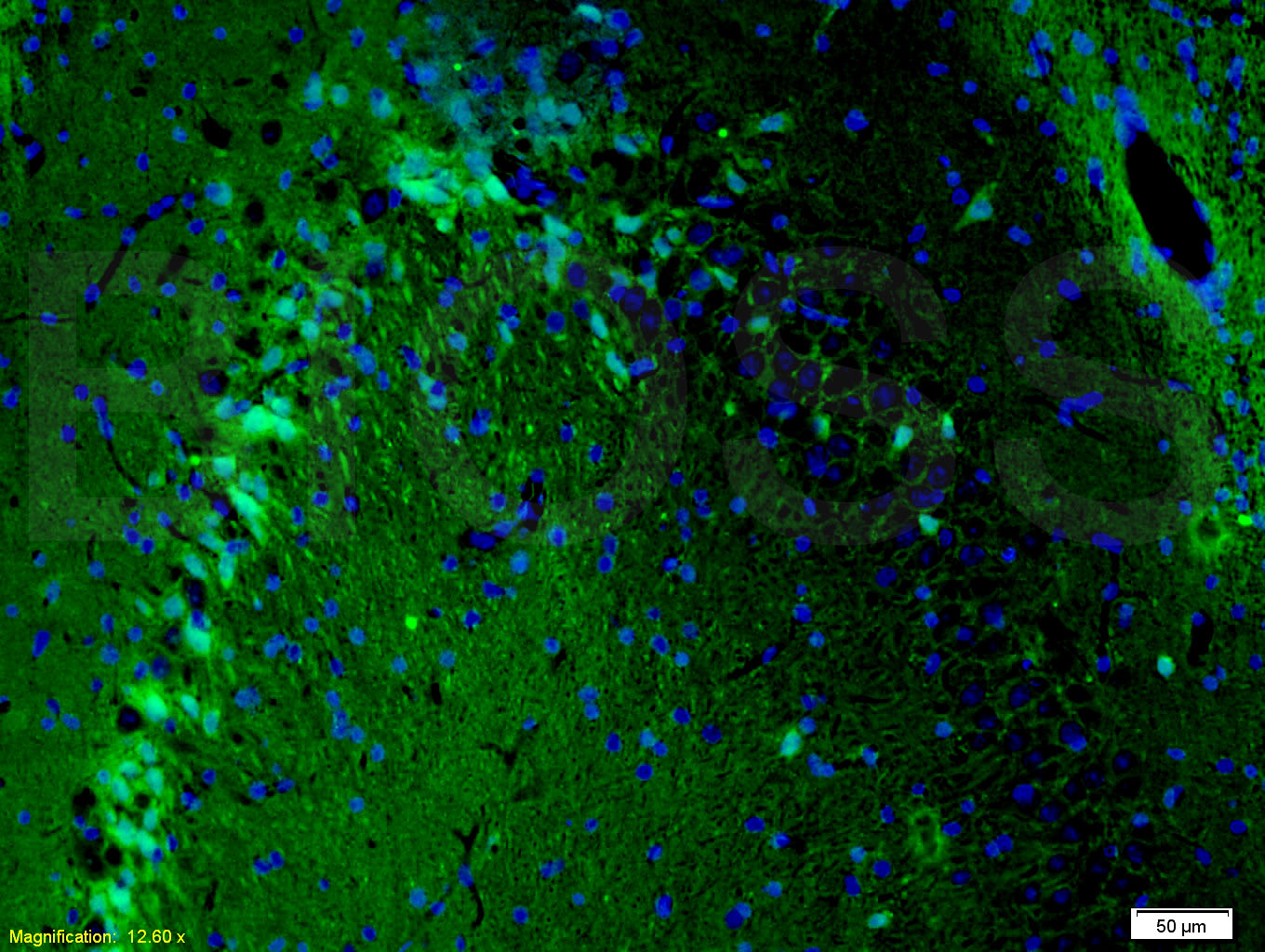 Paraformaldehyde-fixed, paraffin embedded (Mouse brain); Antigen retrieval by boiling in sodium citrate buffer (pH6.0) for 15min; Block endogenous peroxidase by 3% hydrogen peroxide for 20 minutes; Blocking buffer (normal goat serum) at 37°C for 30min; Antibody incubation with (MAP2) Polyclonal Antibody, Unconjugated (bs-1369R) at 1:400 overnight at 4°C, followed by a conjugated Goat Anti-Rabbit IgG antibody (bs-0295G-FITC) for 90 minutes, and DAPI for nuclei staining.