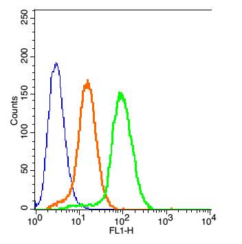 Blank control: 293T(blue). Primary Antibody: Rabbit Anti- MC1 Receptor/AF488 Conjugated antibody (bs-1419R-AF488), Dilution: 1μg in 100 μL 1X PBS containing 0.5% BSA; Isotype Control Antibody: Rabbit IgG/AF488(orange) ,used under the same conditions.