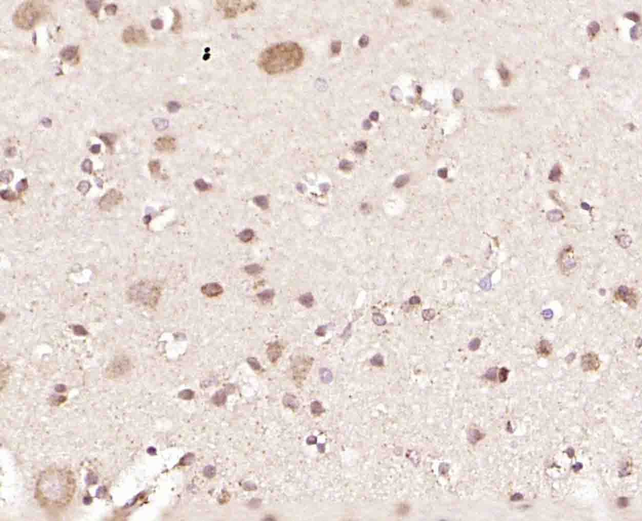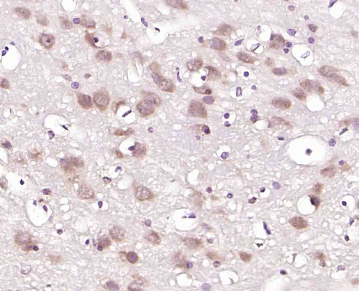 Paraformaldehyde-fixed, paraffin embedded (human brain); Antigen retrieval by boiling in sodium citrate buffer (pH6.0) for 15min; Block endogenous peroxidase by 3% hydrogen peroxide for 20 minutes; Blocking buffer (normal goat serum) at 37°C for 30min; Incubation with (GRP75) Polyclonal Antibody, Unconjugated (bs-1469R) at 1:200 overnight at 4°C, followed by operating according to SP Kit(Rabbit) (sp-0023) instructionsand DAB staining.