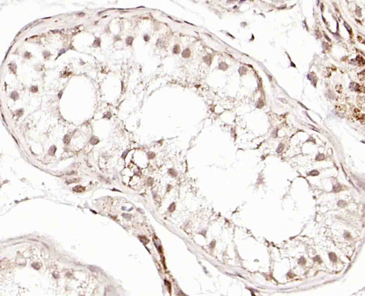 Paraformaldehyde-fixed, paraffin embedded (human testis); Antigen retrieval by boiling in sodium citrate buffer (pH6.0) for 15min; Block endogenous peroxidase by 3% hydrogen peroxide for 20 minutes; Blocking buffer (normal goat serum) at 37°C for 30min; Incubation with (GRP75) Polyclonal Antibody, Unconjugated (bs-1469R) at 1:200 overnight at 4°C, followed by operating according to SP Kit(Rabbit) (sp-0023) instructionsand DAB staining.