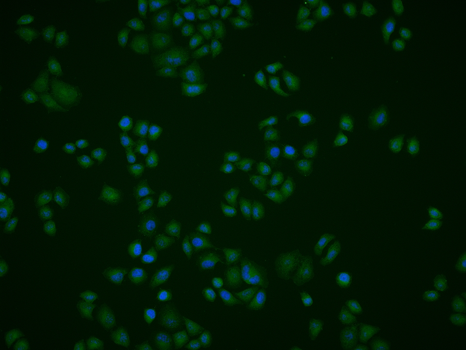 HepG2 cell; 4% Paraformaldehyde-fixed; Triton X-100 at room temperature for 20 min; Blocking buffer (normal goat serum, C-0005) at 37°C for 20 min; Antibody incubation with (PDCD4) polyclonal Antibody, Unconjugated (bs-1608R) 1:100, 90 minutes at 37°C; followed by a conjugated Goat Anti-Rabbit IgG antibody at 37°C for 90 minutes, DAPI (blue, C02-04002) was used to stain the cell nuclei.