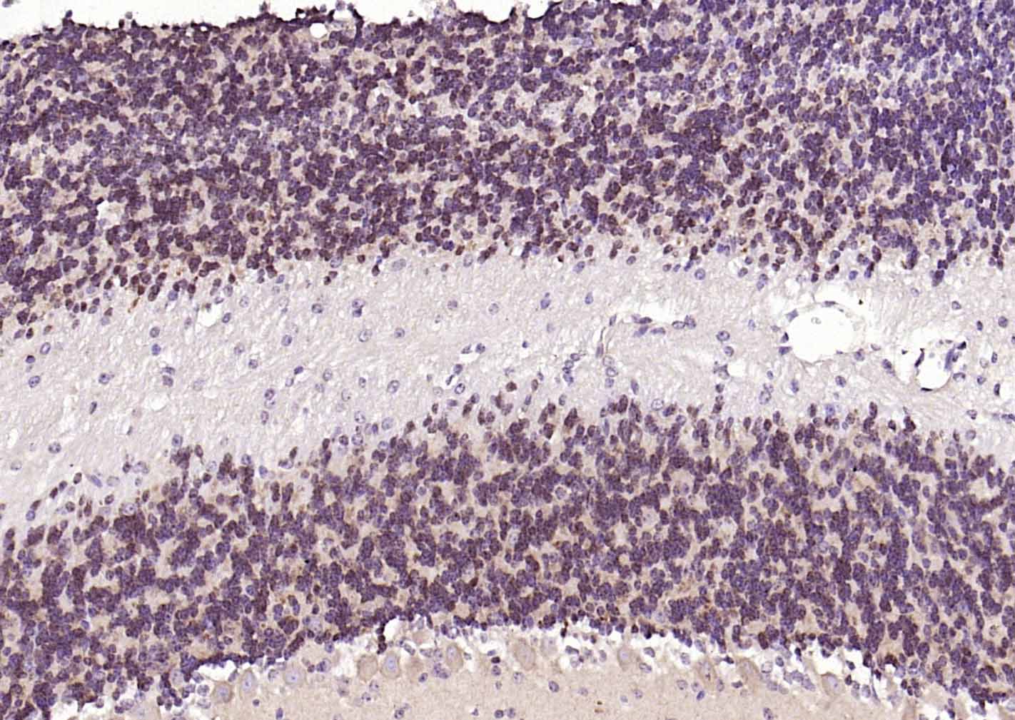 Paraformaldehyde-fixed, paraffin embedded (mouse cerebellum); Antigen retrieval by boiling in sodium citrate buffer (pH6.0) for 15min; Block endogenous peroxidase by 3% hydrogen peroxide for 20 minutes; Blocking buffer (normal goat serum) at 37°C for 30min; Incubation with (NeuN) Polyclonal Antibody, Unconjugated (bs-1613R) at 1:200 overnight at 4°C, followed by operating according to SP Kit(Rabbit) (sp-0023) instructionsand DAB staining.