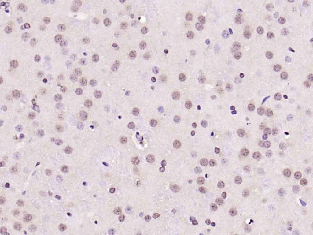 Paraformaldehyde-fixed, paraffin embedded (rat cerebellum); Antigen retrieval by boiling in sodium citrate buffer (pH6.0) for 15min; Block endogenous peroxidase by 3% hydrogen peroxide for 20 minutes; Blocking buffer (normal goat serum) at 37°C for 30min; Incubation with (NeuN) Polyclonal Antibody, Unconjugated (bs-1613R) at 1:200 overnight at 4°C, followed by operating according to SP Kit(Rabbit) (sp-0023) instructionsand DAB staining.