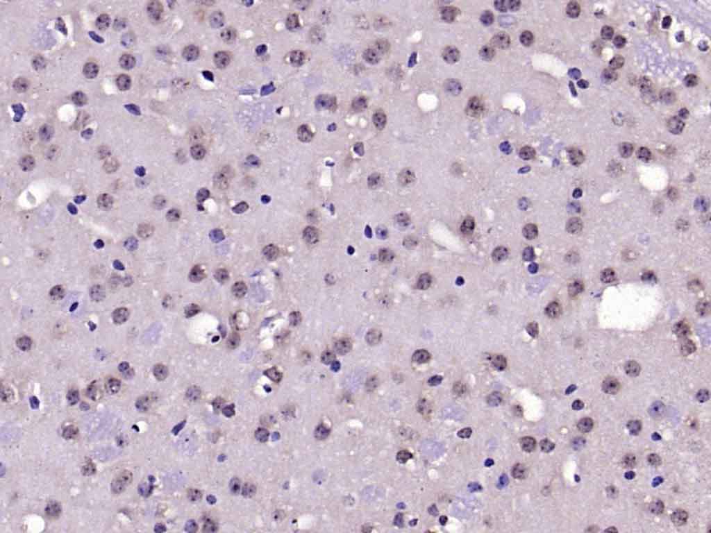 Paraformaldehyde-fixed, paraffin embedded (mouse brain); Antigen retrieval by boiling in sodium citrate buffer (pH6.0) for 15min; Block endogenous peroxidase by 3% hydrogen peroxide for 20 minutes; Blocking buffer (normal goat serum) at 37°C for 30min; Antibody incubation with (NeuN) Polyclonal Antibody, Unconjugated (bs-1613R) at 1:200 overnight at 4°C, followed by operating according to SP Kit(Rabbit) (sp-0023) instructionsand DAB staining.