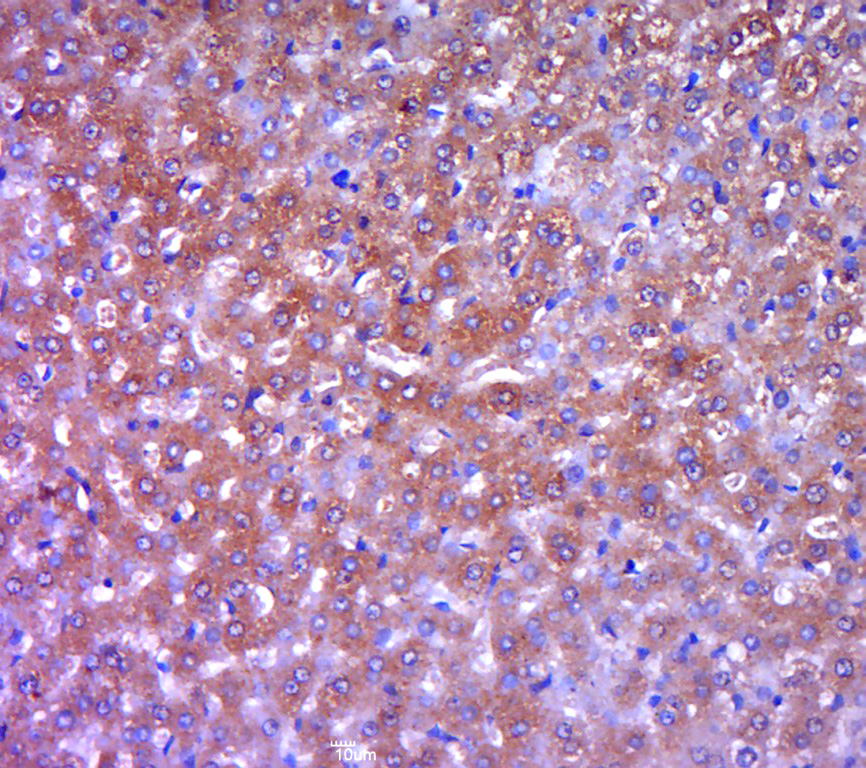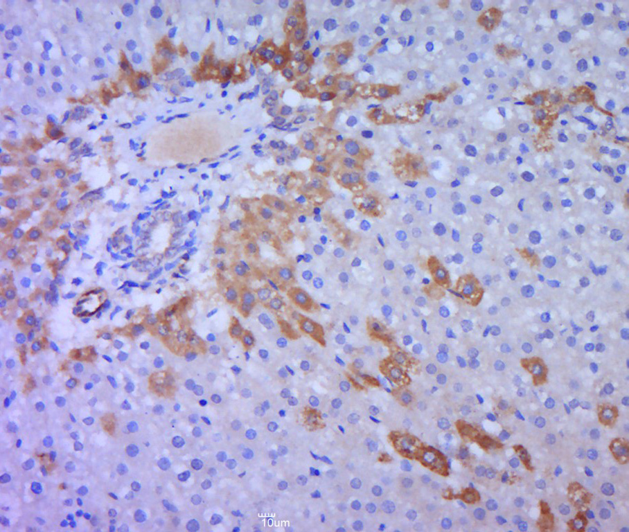 Paraformaldehyde-fixed, paraffin embedded (rat liver tissue); Antigen retrieval by boiling in sodium citrate buffer (pH6.0) for 15min; Block endogenous peroxidase by 3% hydrogen peroxide for 20 minutes; Blocking buffer (normal goat serum) at 37°C for 30min; Antibody incubation with (ABP) Polyclonal Antibody, Unconjugated (bs-2410R) at 1:400 overnight at 4°C, followed by a conjugated secondary (sp-0023) for 20 minutes and DAB staining.