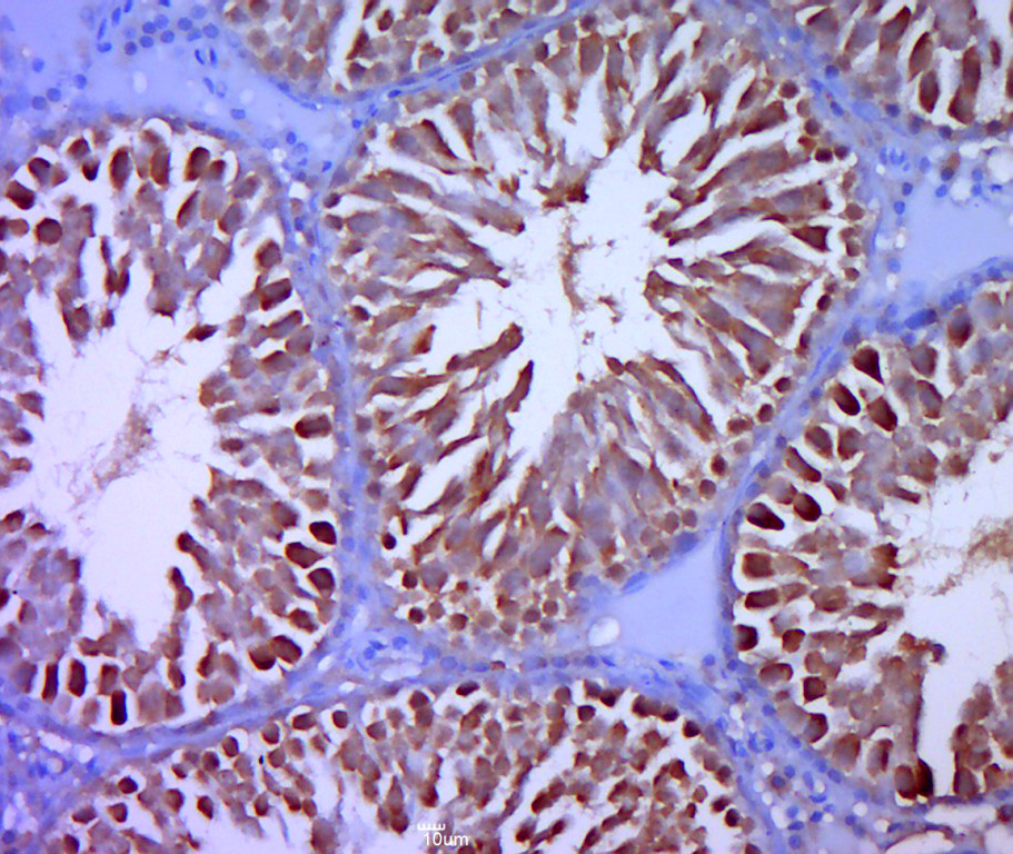 Paraformaldehyde-fixed, paraffin embedded (rat testis tissue); Antigen retrieval by boiling in sodium citrate buffer (pH6.0) for 15min; Block endogenous peroxidase by 3% hydrogen peroxide for 20 minutes; Blocking buffer (normal goat serum) at 37°C for 30min; Antibody incubation with (ABP) Polyclonal Antibody, Unconjugated (bs-2410R) at 1:400 overnight at 4°C, followed by a conjugated secondary (sp-0023) for 20 minutes and DAB staining.