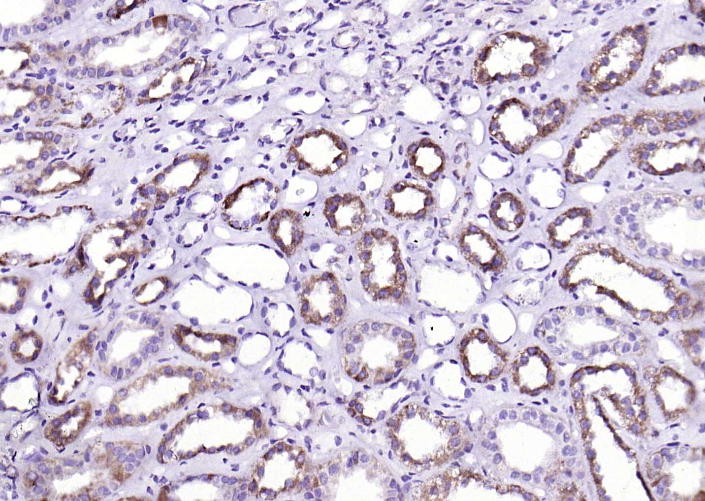 Paraformaldehyde-fixed, paraffin embedded (Human kidney); Antigen retrieval by boiling in sodium citrate buffer (pH6.0) for 15min; Block endogenous peroxidase by 3% hydrogen peroxide for 20 minutes; Blocking buffer (normal goat serum) at 37°C for 30min; Antibody incubation with (BMPR1A) Polyclonal Antibody, Unconjugated (bs-1509R) at 1:200 overnight at 4°C, followed by operating according to SP Kit(Rabbit) (sp-0023) instructionsand DAB staining.