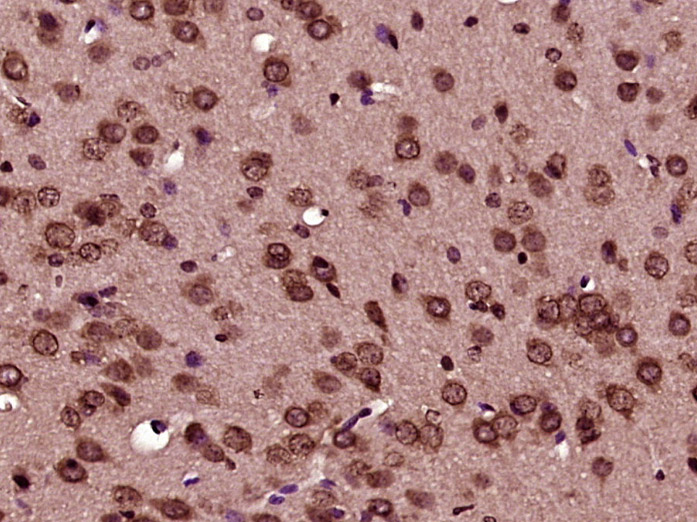 Paraformaldehyde-fixed, paraffin embedded (mouse brain tissue); Antigen retrieval by boiling in sodium citrate buffer (pH6.0) for 15min; Block endogenous peroxidase by 3% hydrogen peroxide for 20 minutes; Blocking buffer (normal goat serum) at 37°C for 30min; Antibody incubation with (Bcl-xL) Polyclonal Antibody, Unconjugated (bs-1336R) at 1:400 overnight at 4°C, followed by operating according to SP Kit(Rabbit) (sp-0023) instructionsand DAB staining.