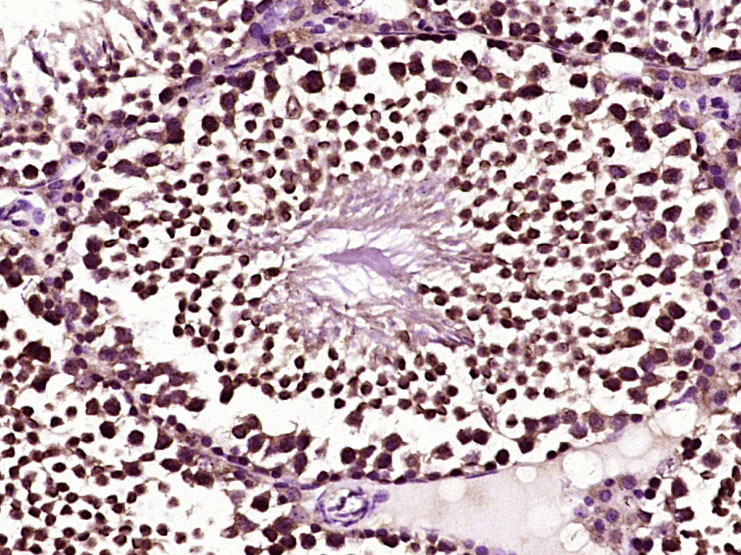 Paraformaldehyde-fixed, paraffin embedded (mouse testis tissue); Antigen retrieval by boiling in sodium citrate buffer (pH6.0) for 15min; Block endogenous peroxidase by 3% hydrogen peroxide for 20 minutes; Blocking buffer (normal goat serum) at 37°C for 30min; Antibody incubation with (Bcl-xL) Polyclonal Antibody, Unconjugated (bs-1336R) at 1:400 overnight at 4°C, followed by operating according to SP Kit(Rabbit) (sp-0023) instructionsand DAB staining.