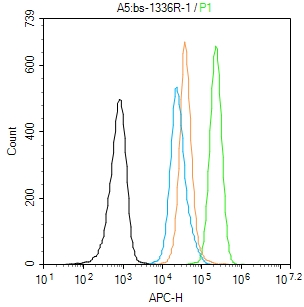 Blank control: A431. Primary Antibody (green line): Rabbit Anti-Bcl-xL antibody (bs-1336R) Dilution: 1μg /10^6 cells; Isotype Control Antibody (orange line): Rabbit IgG . Secondary Antibody : Goat anti-rabbit IgG-AF647 Dilution: 1μg /test. Protocol The cells were fixed with 4% PFA (10min at room temperature)and then permeabilized with 90% ice-cold methanol for 20 min at-20℃. The cells were then incubated in 5%BSA to block non-specific protein-protein interactions for 30 min at at room temperature .Cells stained with Primary Antibody for 30 min at room temperature. The secondary antibody used for 40 min at room temperature. Acquisition of 20,000 events was performed.