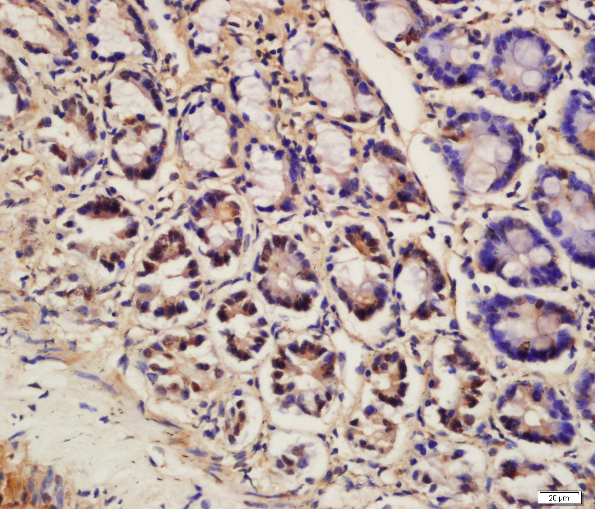 Paraformaldehyde-fixed, paraffin embedded (rat colon tissue); Antigen retrieval by boiling in sodium citrate buffer (pH6.0) for 15min; Block endogenous peroxidase by 3% hydrogen peroxide for 20 minutes; Blocking buffer (normal goat serum) at 37°C for 30min; Antibody incubation with (Ubiquitin) Polyclonal Antibody, Unconjugated (bs-1549R) at 1:400 overnight at 4°C, followed by a conjugated secondary (sp-0023) for 20 minutes and DAB staining.
