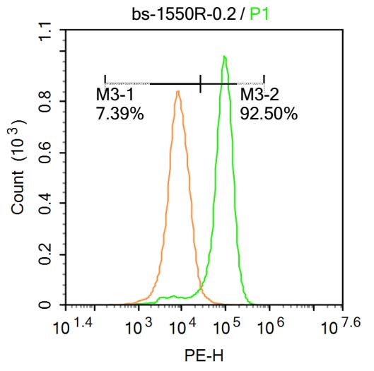 U-937 cells were fixed with 4% PFA for 10min at room temperature,permeabilized with 20% PBST for 20 min at room temperature, and incubated in 5% BSA blocking buffer for 30 min at room temperature. Cells were then stained with CXCL2 Antibody(bs-1550R) at 1:500 dilution in blocking buffer and incubated for 30 min at room temperature, washed twice with 2%BSA in PBS, followed by secondary antibody incubation for 40 min at room temperature. Acquisitions of 20,000 events were performed. Cells stained with primary antibody (green), and isotype control (orange).