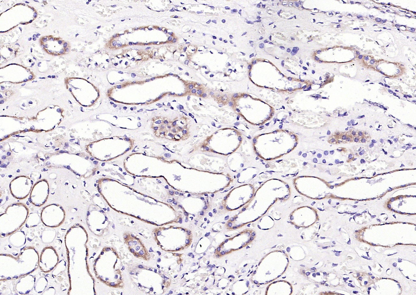 Paraformaldehyde-fixed, paraffin embedded (Human kidney); Antigen retrieval by boiling in sodium citrate buffer (pH6.0) for 15min; Block endogenous peroxidase by 3% hydrogen peroxide for 20 minutes; Blocking buffer (normal goat serum) at 37°C for 30min; Antibody incubation with (CRIPTO) Polyclonal Antibody, Unconjugated (bs-1566R) at 1:200 overnight at 4°C, followed by operating according to SP Kit(Rabbit) (sp-0023) instructionsand DAB staining.