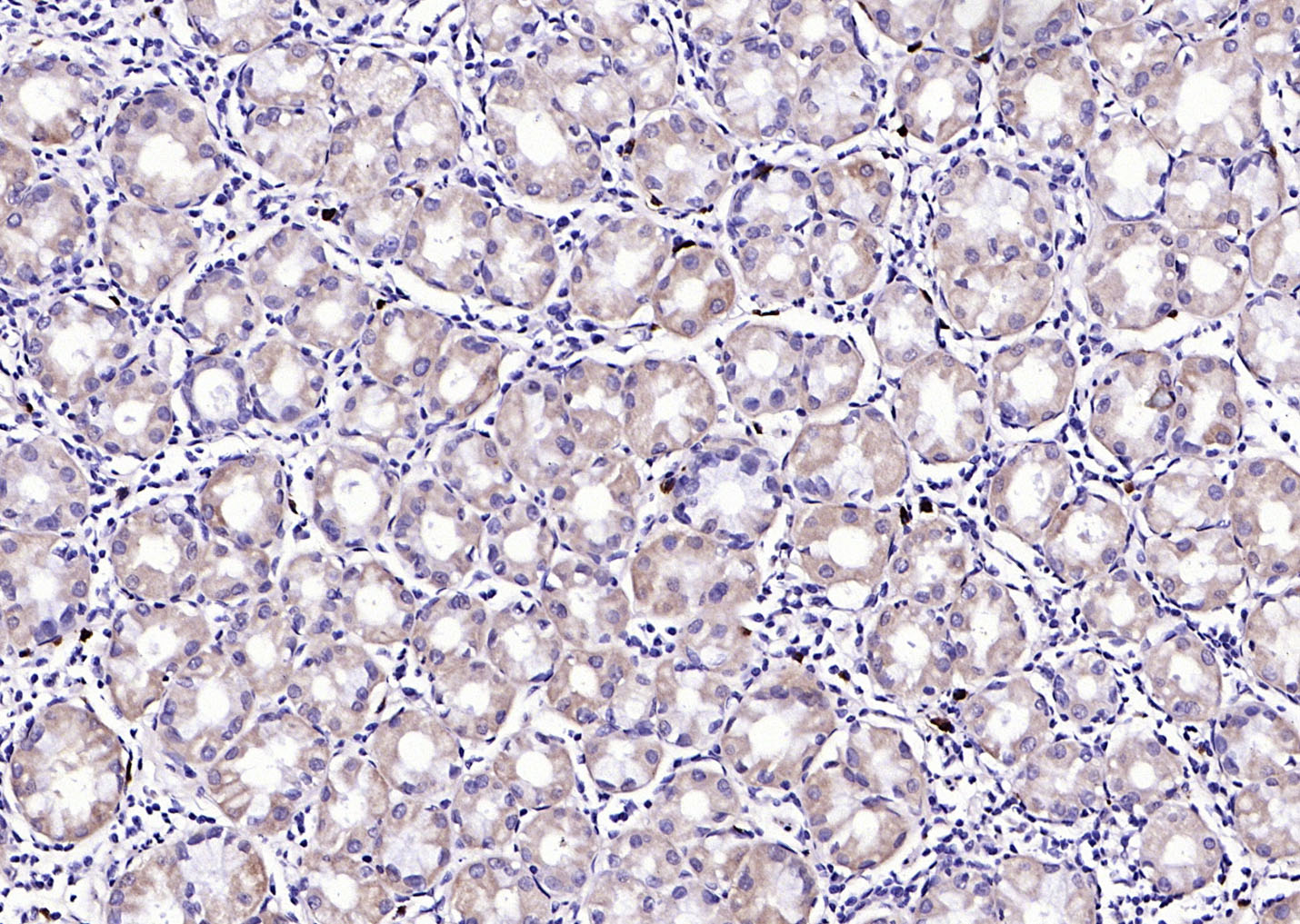 Paraformaldehyde-fixed, paraffin embedded (Human stomach); Antigen retrieval by boiling in sodium citrate buffer (pH6.0) for 15min; Block endogenous peroxidase by 3% hydrogen peroxide for 20 minutes; Blocking buffer (normal goat serum) at 37°C for 30min; Antibody incubation with (CRIPTO) Polyclonal Antibody, Unconjugated (bs-1566R) at 1:200 overnight at 4°C, followed by operating according to SP Kit(Rabbit) (sp-0023) instructionsand DAB staining.