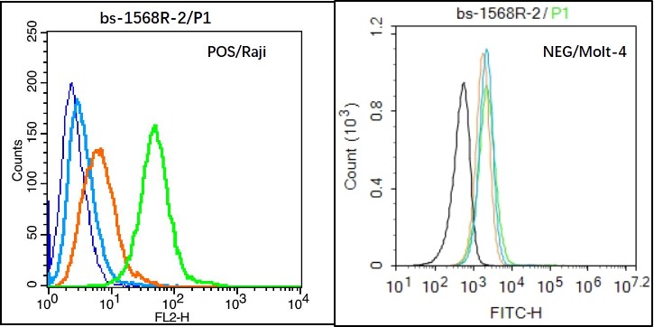 Raji(Positive)and Molt4(Negative control)cells (black) were incubated in 5% BSA blocking buffer for 30 min at room temperature. Cells were then stained with ENPP3 Antibody(bs-1568R)at 1:50 dilution in blocking buffer and incubated for 30 min at room temperature, washed twice with 2% BSA in PBS, followed by secondary antibody(blue) incubation for 40 min at room temperature. Acquisitions of 20,000 events were performed. Cells stained with primary antibody (green), and isotype control (orange).