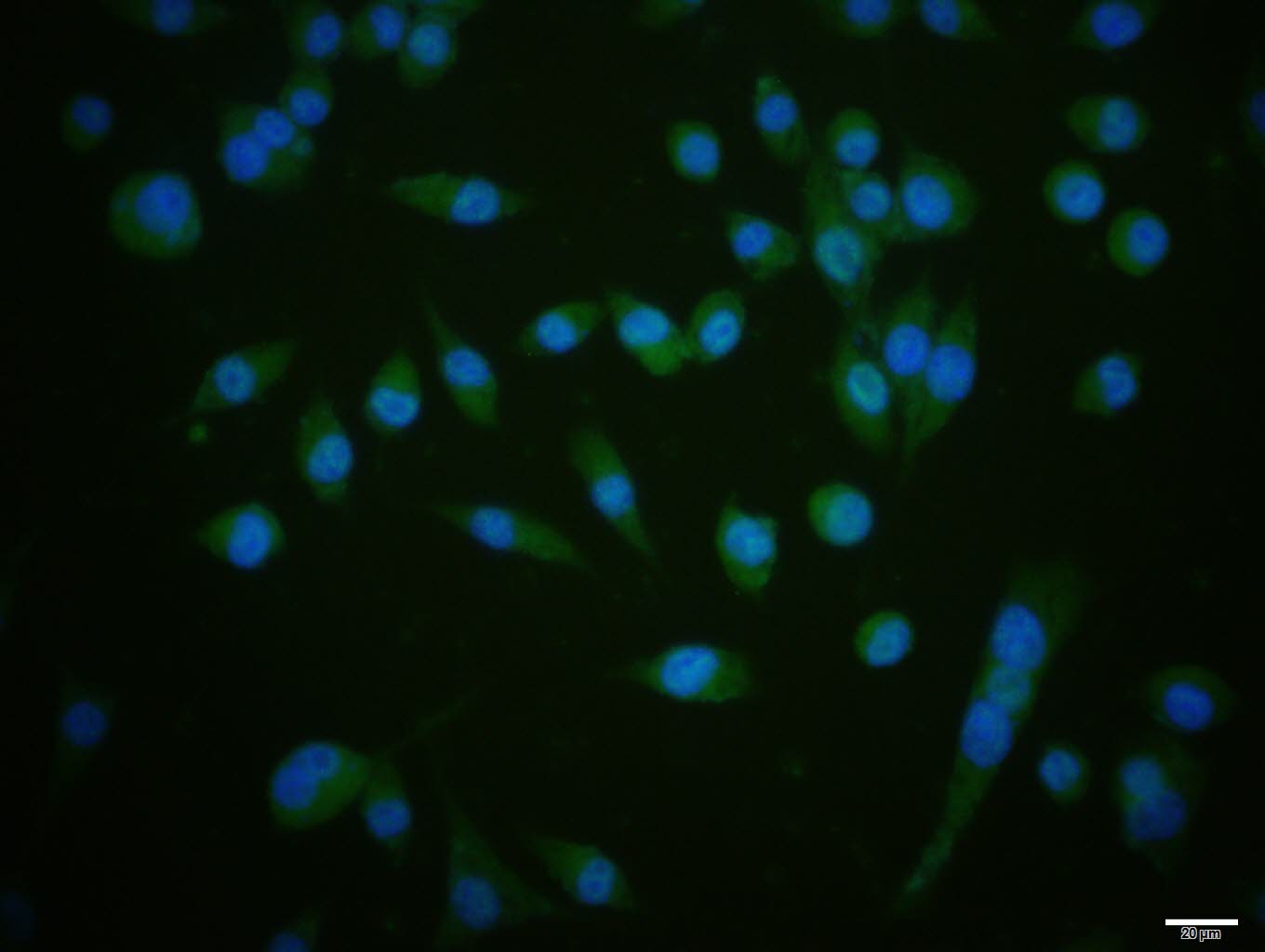 NIH/3T3 cell; 4% Paraformaldehyde-fixed; Triton X-100 at room temperature for 20 min; Blocking buffer (normal goat serum, C-0005) at 37°C for 20 min; Antibody incubation with (PIK3CA) polyclonal Antibody, Unconjugated (bs-2067R) 1:100, 90 minutes at 37°C; followed by a conjugated Goat Anti-Rabbit IgG antibody at 37°C for 90 minutes, DAPI (blue, C02-04002) was used to stain the cell nuclei.