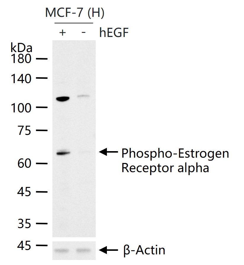 MCF-7 (H) cells were treated withhEGF (100ng/ml) for 15 min, 25 μg total protein per lane of cell lysates (see on figure) probed with Phospho-Estrogen Receptor alpha (Tyr537) polyclonal antibody, unconjugated (bs-1643R) at 1:1000 dilution and 4°C overnight incubation. Followed by conjugated secondary antibody incubation at r.t. for 60 min.
