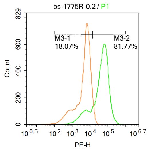 U-937 cells were fixed with 4% PFA for 10min at room temperature,permeabilized with 90% ice-cold methanol for 20 min at room temperature, and incubated in 5% BSA blocking buffer for 30 min at room temperature. Cells were then stained with HFH4 Antibody(bs-1775R)at 1:500 dilution in blocking buffer and incubated for 30 min at room temperature, washed twice with 2%BSA in PBS, followed by secondary antibody incubation for 40 min at room temperature. Acquisitions of 20,000 events were performed. Cells stained with primary antibody (green), and isotype control (orange).