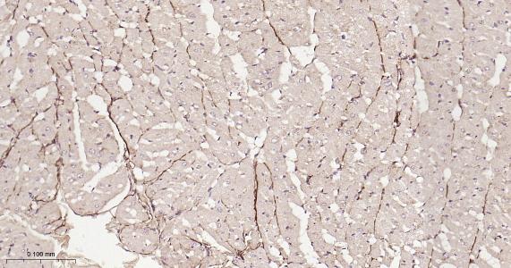 Paraformaldehyde-fixed, paraffin embedded Rat Heart; Antigen retrieval by boiling in sodium citrate buffer (pH6.0) for 15 min; Antibody incubation with ITGA7 Polyclonal Antibody, Unconjugated (bs-1816R) at 1:200 overnight at 4°C, followed by conjugation to the bs-0295G-HRP and DAB (C-0010) staining.
